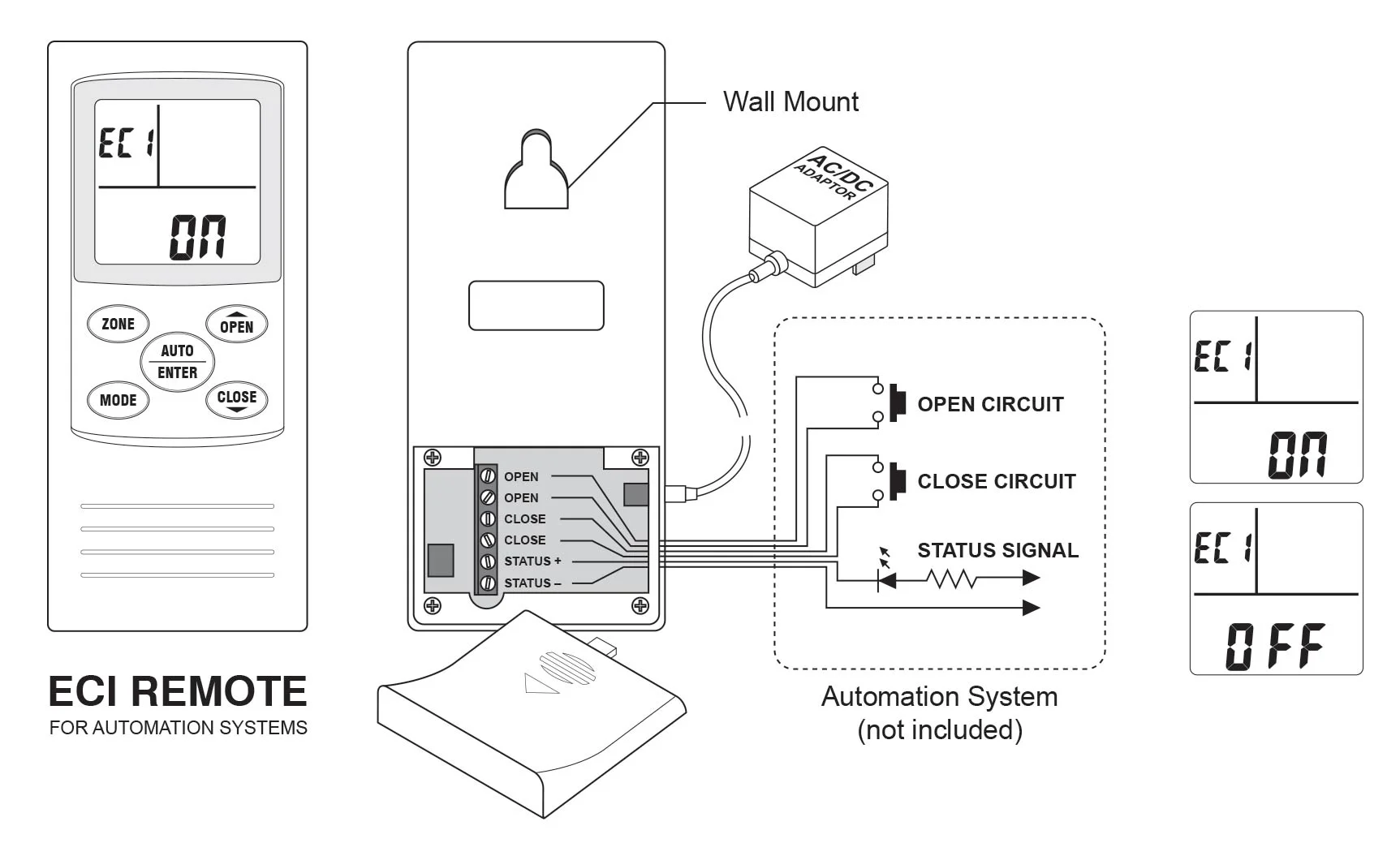 The ECI Remote will operate either a single zone or all zones. The ECI Remote requires a wall outlet for constant power as well as be wired directly to the automation system.